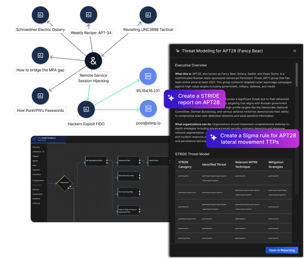Agentic TI Ops adds a full intelligence operations layer. Intel Agents assemble evolving intelligence as threats develop. Our Agentic Threat Intelligence Platform structures it into reusable records, scores it, routes it, and distributes it across detection engineering, incident response, hunting, and reporting—automatically.
