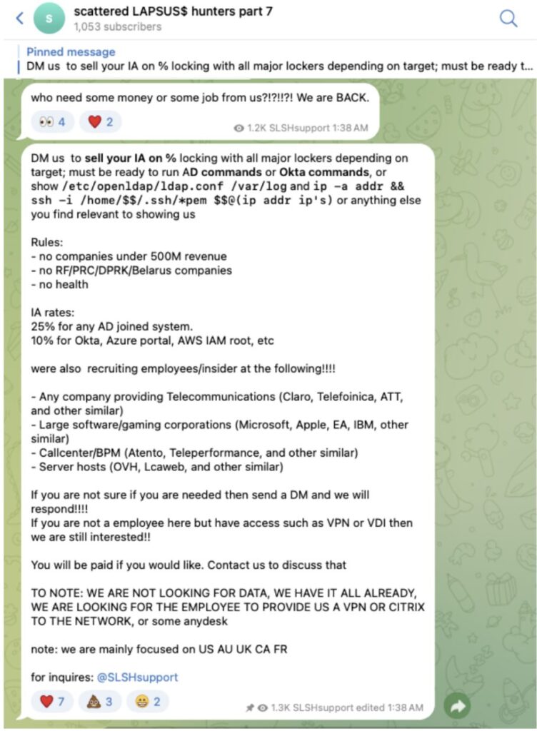 Modern threat actors like Scattered LAPSUS$ Hunters are actively advertising for company insiders who can grant them direct access to internal systems. While everyone would like to believe that an employee would never give up access for financial gain, it’s impossible to know whether external factors such as personal debts or a sick family member could influence an individual to help the actors out.