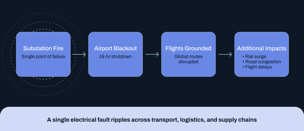 Consider what happened at Heathrow Airport in March 2025. A fire at a nearby electrical substation cut power to the airport and forced an 18-hour shutdown. The immediate impact—grounded flights, stranded passengers—was severe enough. But the ripple effects spread further. Connecting flights across Europe were disrupted. Freight was delayed. Travellers scrambled for alternative routes by road and rail, putting sudden pressure on networks not designed to absorb the surge. One electrical component failed; a global hub went dark for nearly a day; and the consequences moved well beyond the terminal gates.