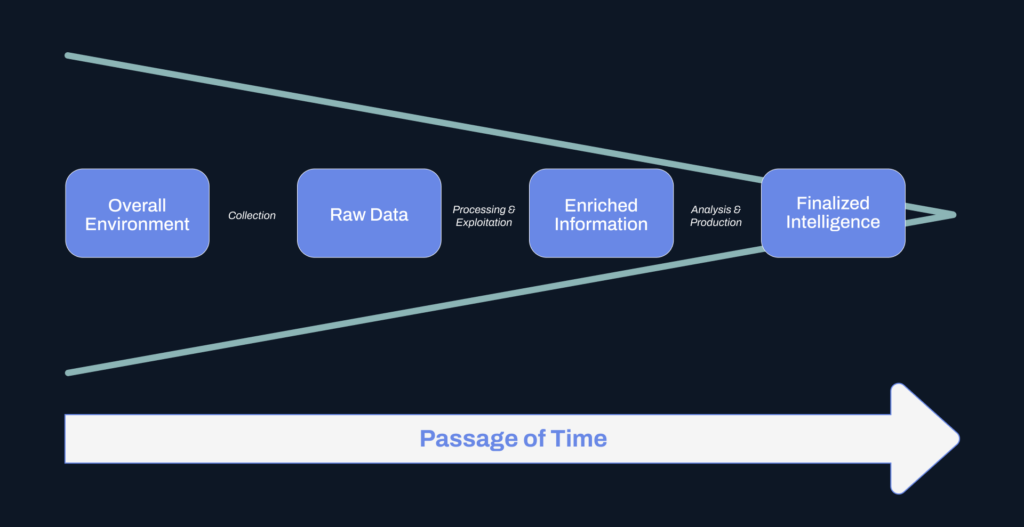 The domain of intelligence is fundamentally one of decision support. Stakeholders and decision-makers face uncertainty across many instances, and intelligence as both discipline and product works to reduce—although not necessarily eliminate—such uncertainty to allow for better outcomes. This process can be viewed as one of refinement, from raw data collected for further processing eventually yielding a finalized, researched intelligence product, as displayed in the following diagram.