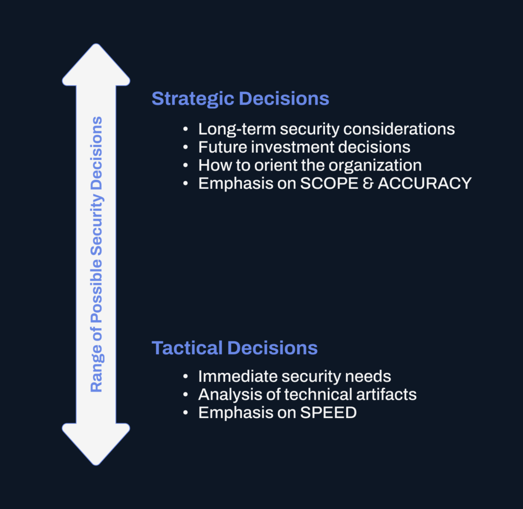 Determining mechanisms to arrive at “good enough” information sooner, rather than “perfect” information later, thus becomes an acute need for modern security operations. Understanding the applications of this information and what processes are guided by such actions is crucial in aligning inputs with outcomes, and ensuring that the right audiences receive the support necessary to reduce uncertainty in dispositioning items of security concern.