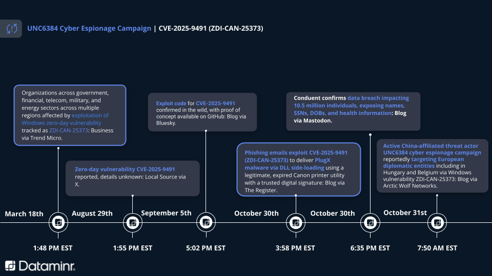 - CVE-2025-9491 was first reported by the Zero Day initiative (ZDI) and alerted by Dataminr in March 2025. Organizations must recognize the threat posed by a vulnerability in core Windows functionality and the timeframe of potential abuse. This will help them search for possible exploitation and plan their remediation.
