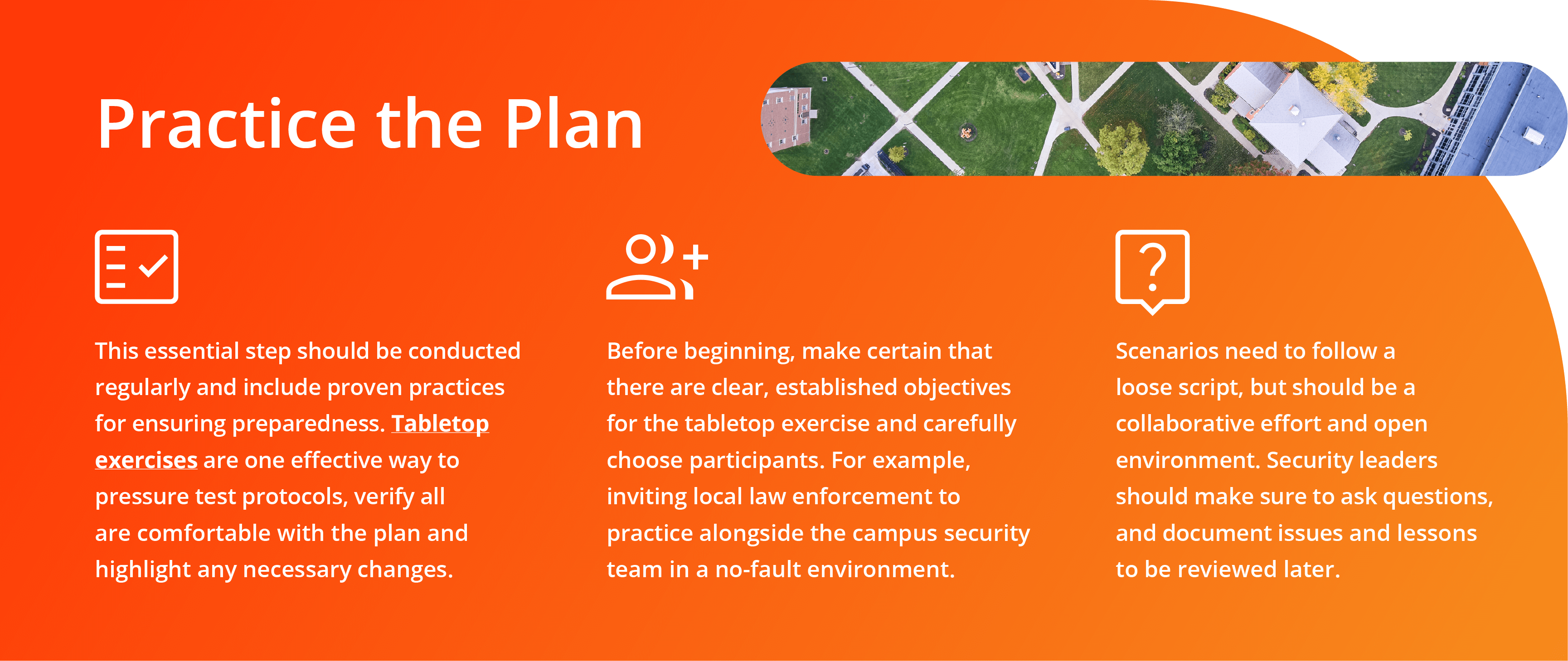 To start, security leaders should create a list of the top 10 potential emergencies that are specific to their school and community, including standard operating procedures (SOPs) and granular instructions for each.