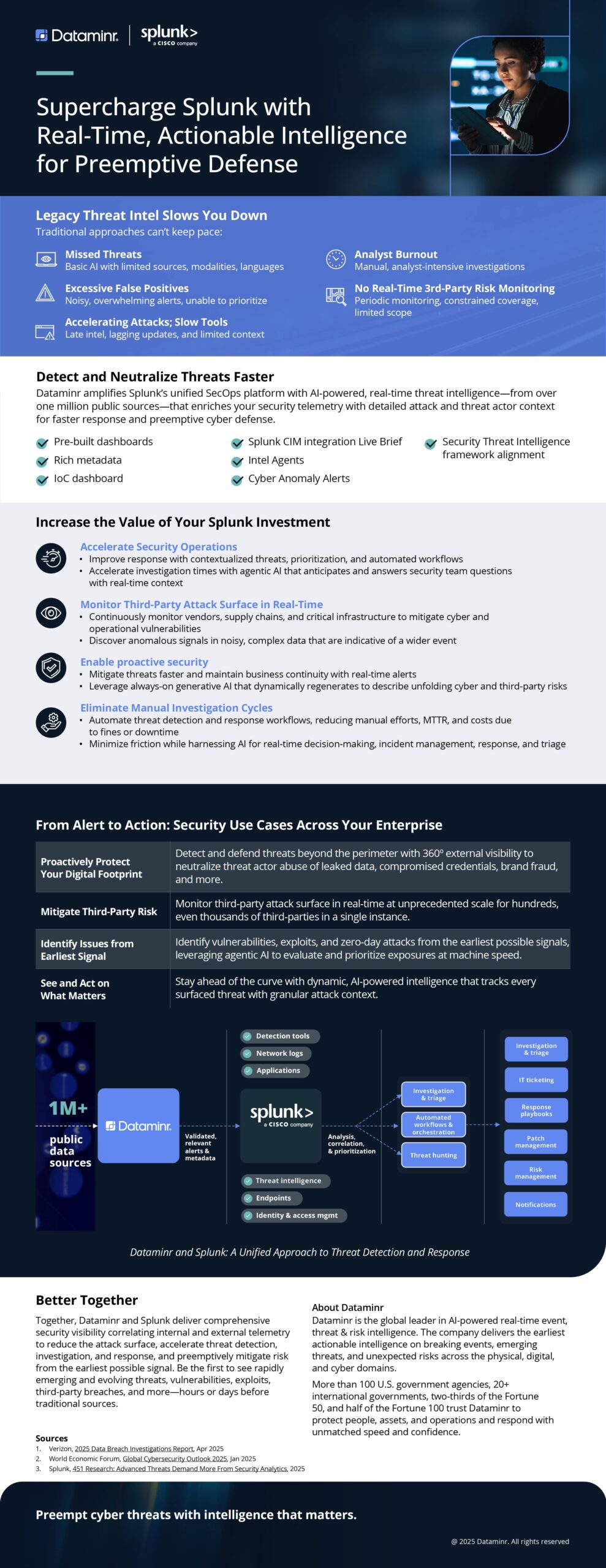 Eliminate hidden vulnerabilities and gain a comprehensive security vantage point by integrating Dataminr’s real-time external threat alerts with Splunk’s robust analytics and orchestration capabilities.