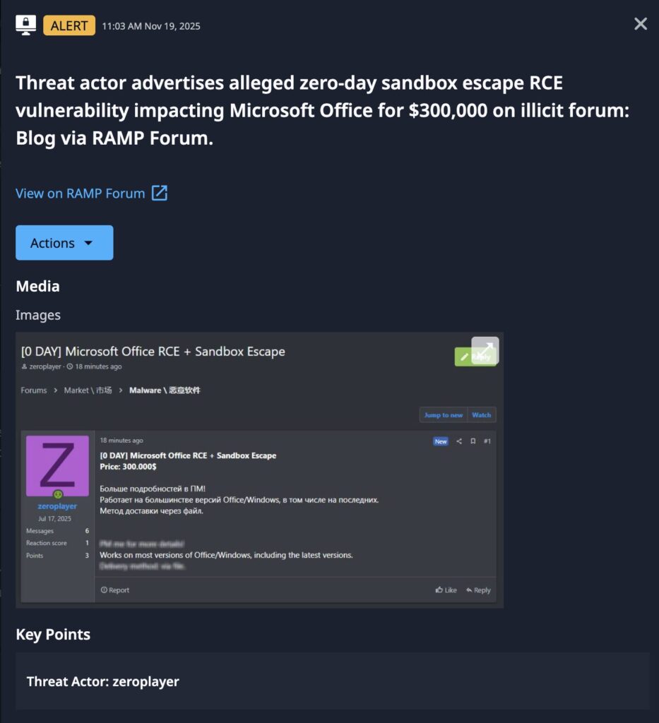 Dataminr Pulse alerted on November 19, 2025, of a threat actor advertising an alleged zero-day exploit targeting Microsoft Office for sale for $300,000 on the Russian cybercrime forum RAMP. While there is not yet evidence of this zero-day, the actor allegedly sold two other legitimate zero-days in the last four months; a WinRAR zero-day remote code execution (RCE) exploit for $80,000 and a WinZip RCE for $100,000. This is reason enough for security teams to operate with extreme awareness around a possible exploit of their Windows Office infrastructure in the near future.