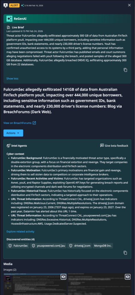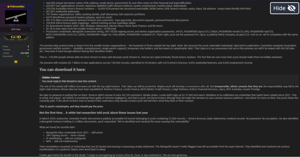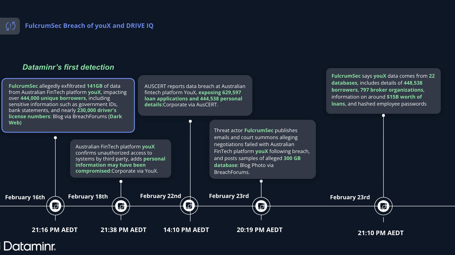 In February 2026, the threat actor group FulcrumSec allegedly exfiltrated approximately 300 GB of data from the Australian FinTech platform youX (formerly known as DRIVE IQ). The breach reportedly impacts over 444,000 unique borrowers and nearly 800 broker organizations. Following a breakdown in ransom negotiations, the threat actor republished samples of the stolen data, as well as alleged internal emails and court summons to pressure the organization. The exfiltration reportedly targeted 22 production databases, including a MongoDB Atlas cluster.