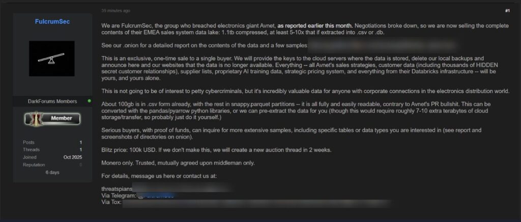 The group, known by the alias “The Threat Thespians,” was first observed around September 2025 and is primarily motivated by financial gain through extortion and data auctioning. Their operating model focuses on data exfiltration and blackmail, often bypassing system encryption entirely to “steal and squeeze,” and they communicate using the email addresses threatspians@fulcrumsec[.]net and their primary address, fulcrumsec@tuta[.]io.