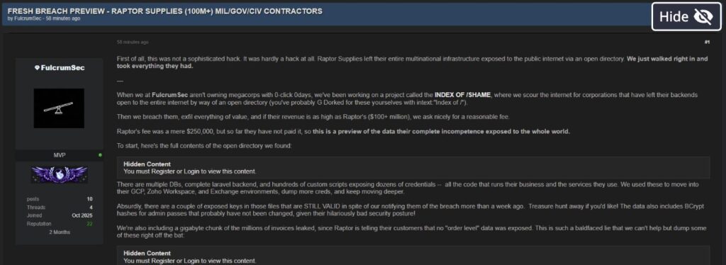 - Aggressive Extortion Tactics: FulcrumSec utilizes a “steal and squeeze” model, bypassing encryption to focus on data exfiltration. They have actively engaged in public shaming by releasing internal emails, court summons, and plaintext data samples to pressure the victim.