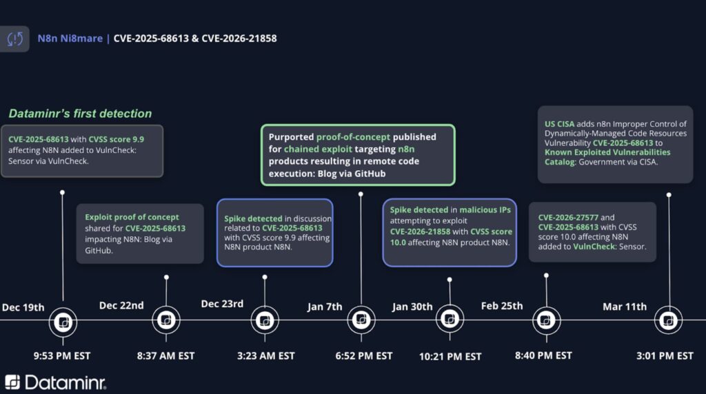 - Critical Vulnerability Chain: The “Ni8mare” threat involves the technical chaining of CVE-2026-21858 (unauthenticated file read) and CVE-2025-68613 (authenticated RCE).