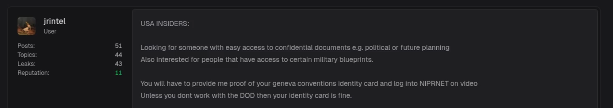 “jrintel” (also known as “JR Intel”) is a financially motivated, high-profile threat actor and information broker who emerged in August 2025. This actor specializes in trafficking sensitive military, intelligence, and government data. Unlike state-sponsored groups that typically align with a single nation’s interests, jrintel acts as a “mercenary broker,” with initial focus on U.S. government and defense contractors, before later expanding focus on a wider range of geopolitical adversaries—including the U.S., China, Russia, Israel, and NATO.